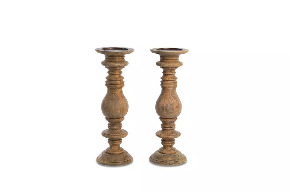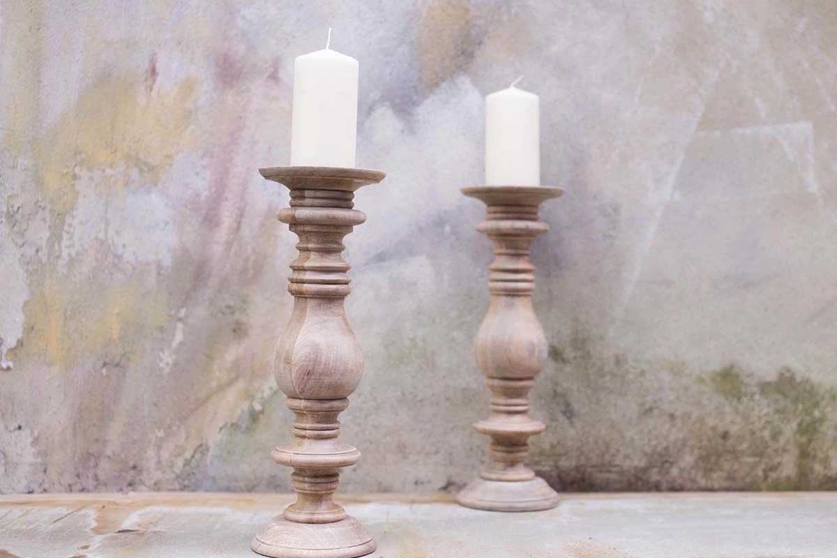 Decorate your fireplace with these tall wooden candlestick holders. Each chunky wooden candle stick is hand turned by skilled artisans from sustainable mango wood. They look beautiful with a church candle on top.