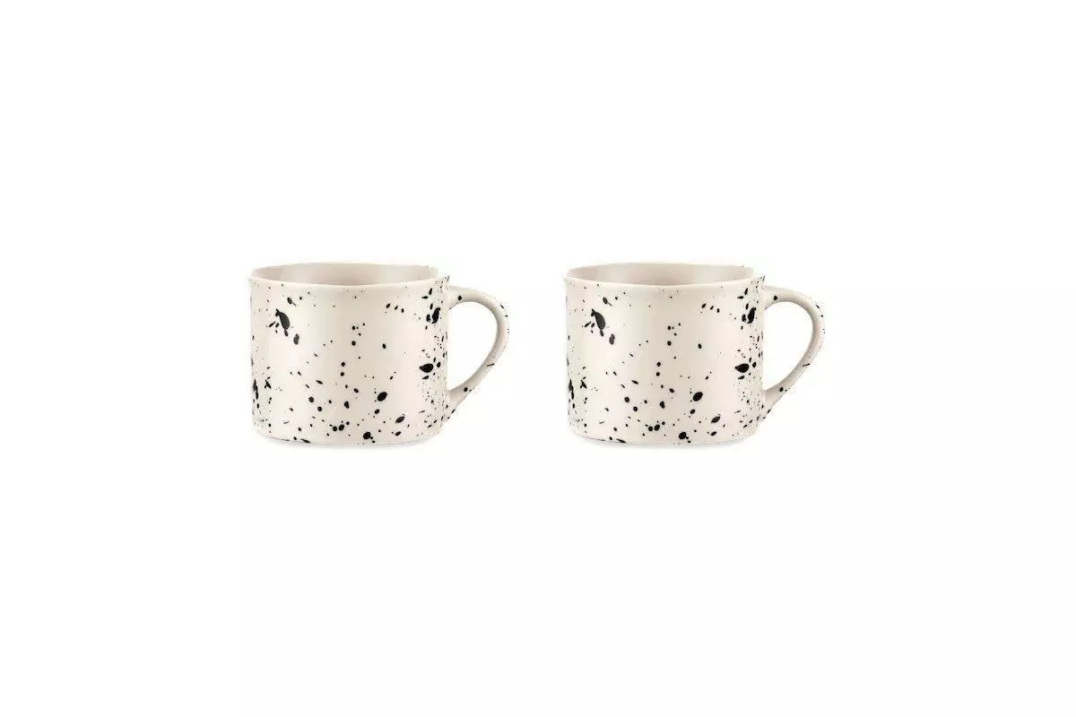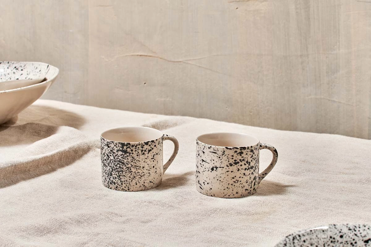 These artisans made Ama short coffee mugs are decorated with a black splatter affect. This eye-catching design is created by hand. These stylish mugs have a smooth glaze finish and tactile quality.