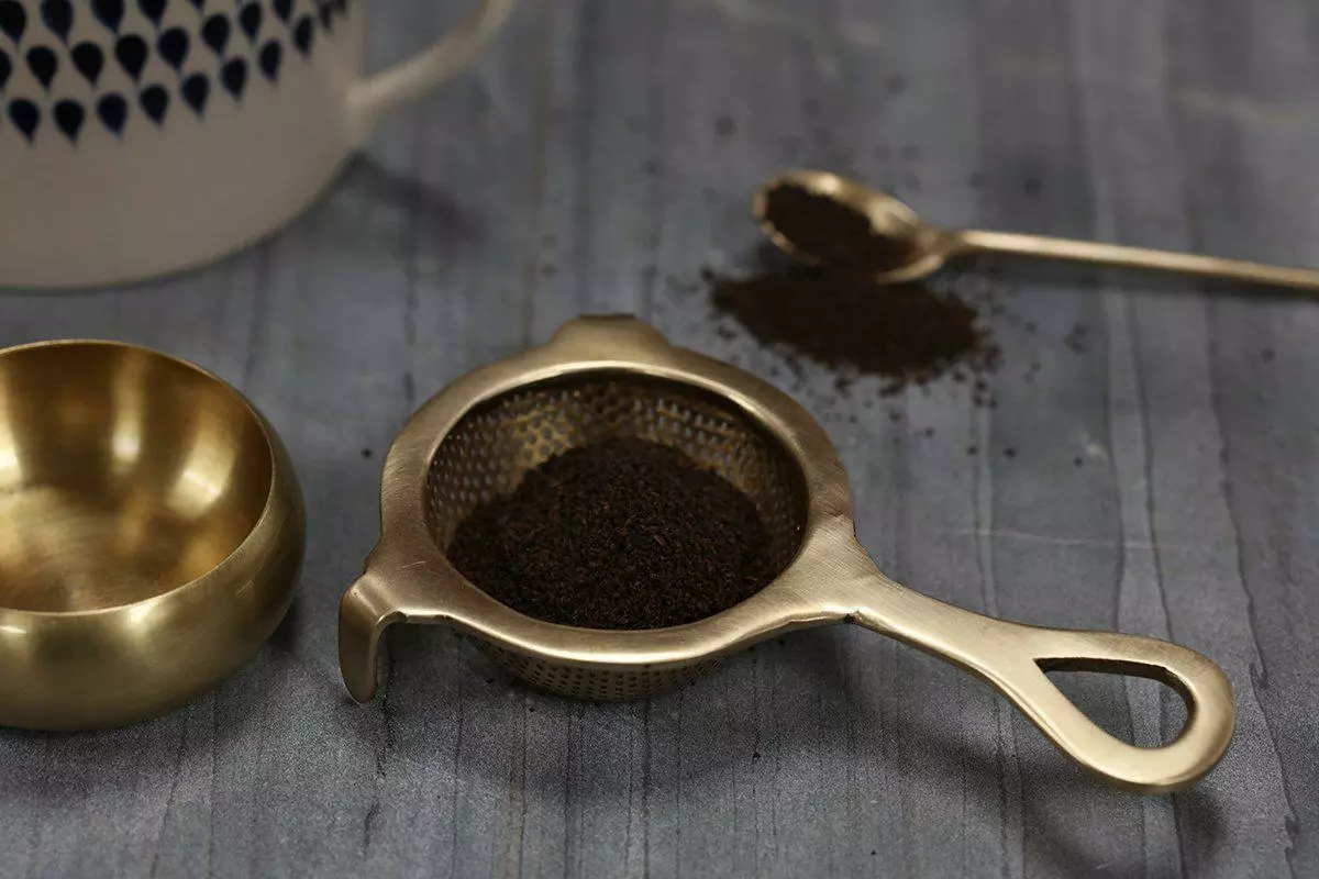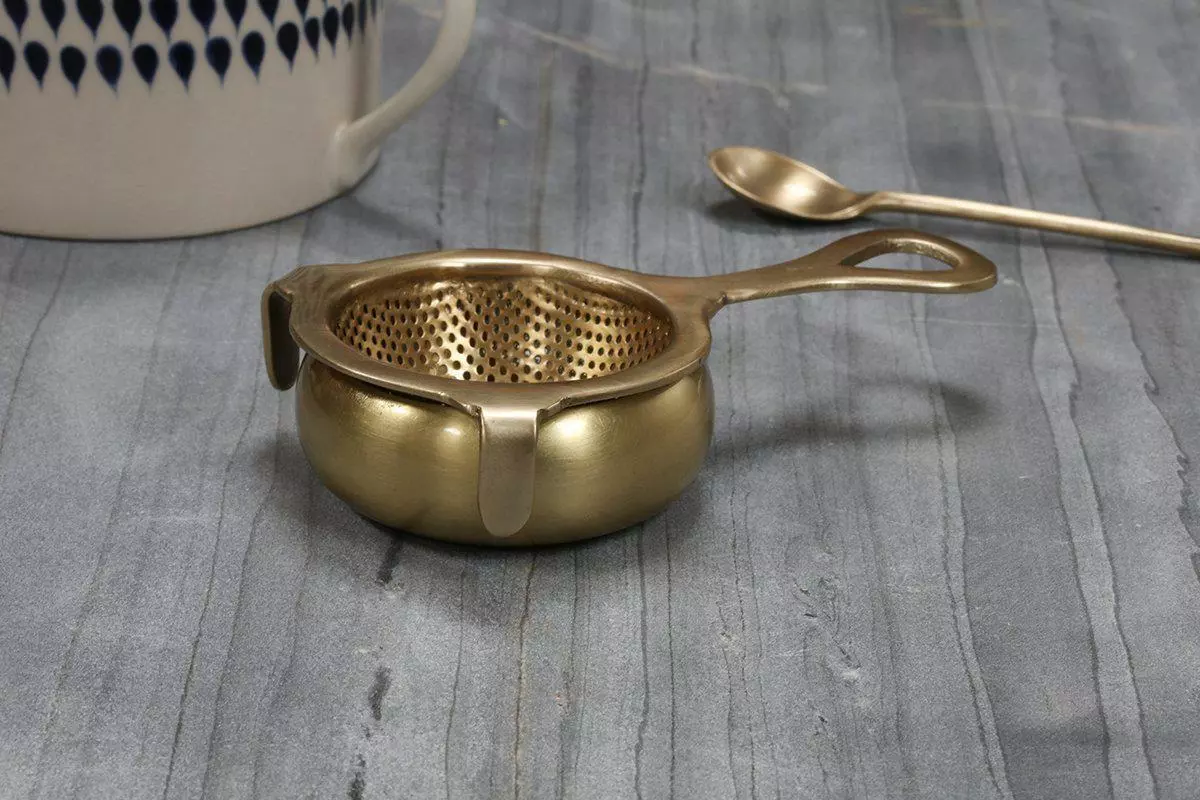 This traditional tea strainer is handmade from brass in a gold finish. It helps make the perfect cup of tea.