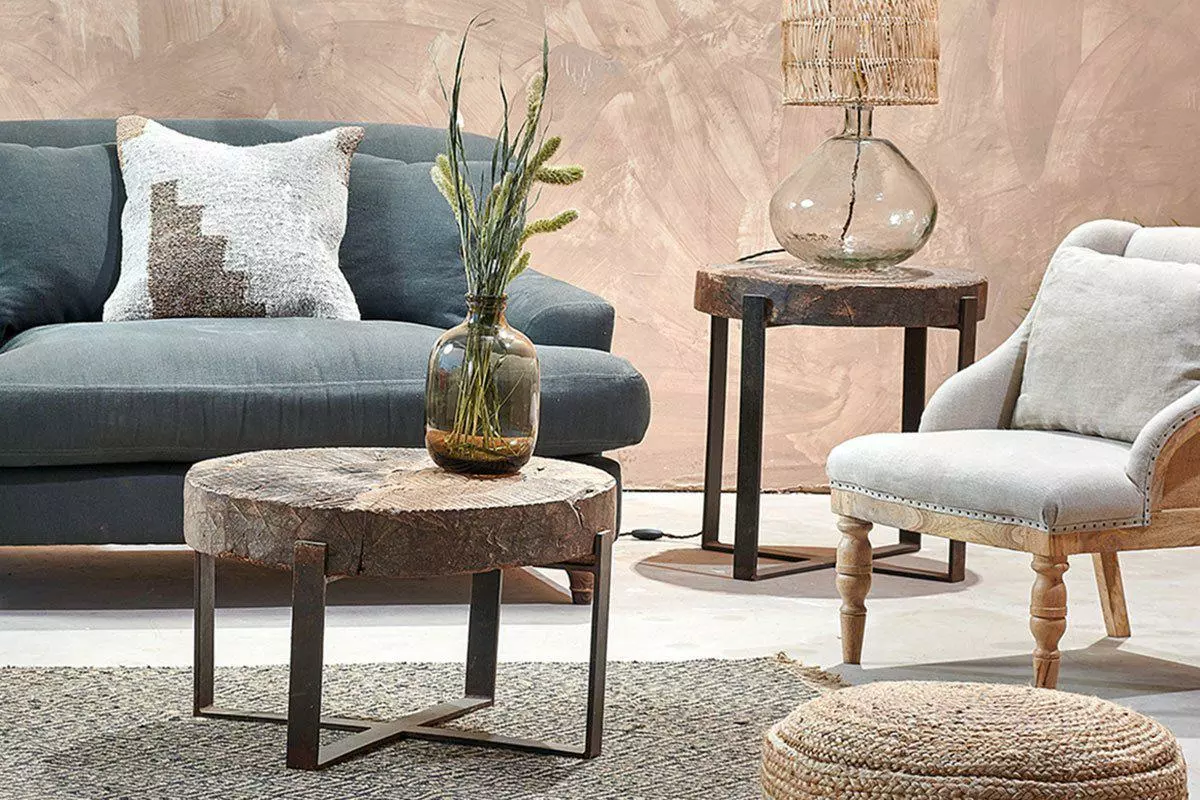This circular reclaimed coffee table has a characterful finish. It is made from reclaimed herb grinders and each one illustrates the marks of its former use.