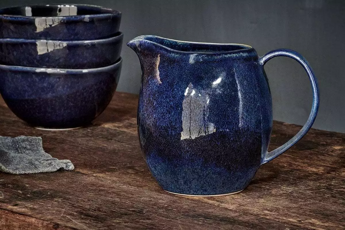Organic shapes and a unique reactive glaze combines in this attractive and practical ceramic jug. The deep indigo – sky tone makes this a striking piece.