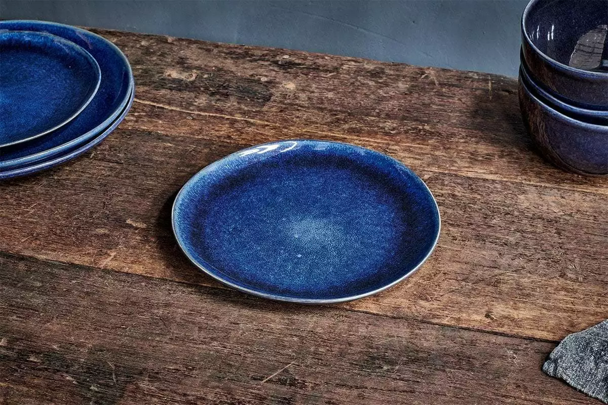 The smooth, shimmering glaze of these striking ceramic side plates enhances the deep indigo – sky blue colour palette, creating a beautiful collection perfect for any occasion. The reactive glaze ensures each one is unique.