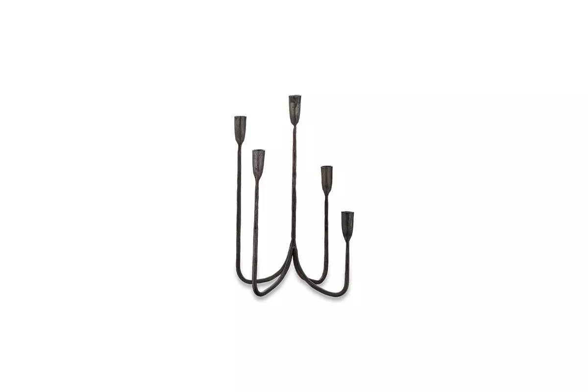 This striking Mbata cluster candelabra has a unique design that is ideal as a statement sideboard candelabra or table centre piece. Hand forged and perfectly positioned each candle holder sits at a varying heights. The antique black finish adds to the drama of the piece.