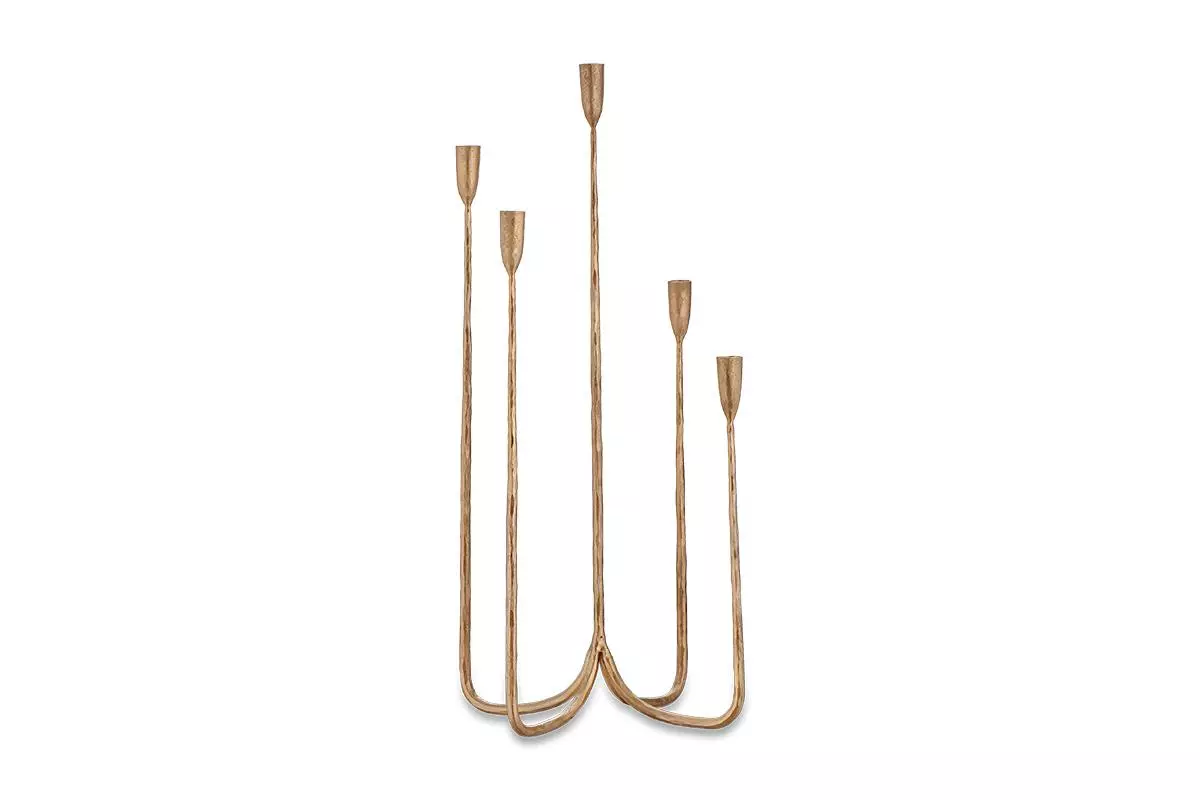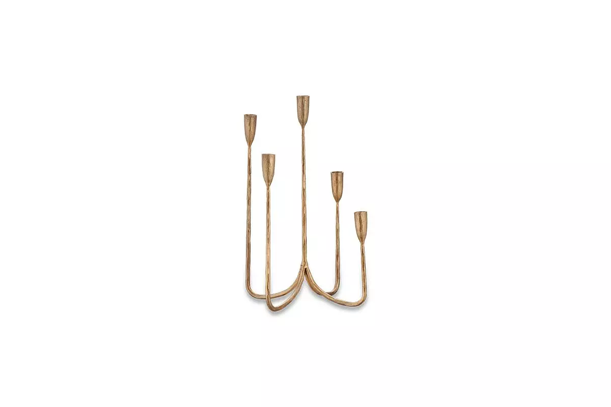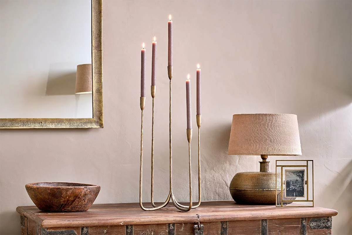 The Mbata cluster candelabra has a discerning design that is ideal as table centre piece or sideboard feature. Hand forged from iron and finished in an elegant aged brass tone; the five candles holders are positioned at varying heights.