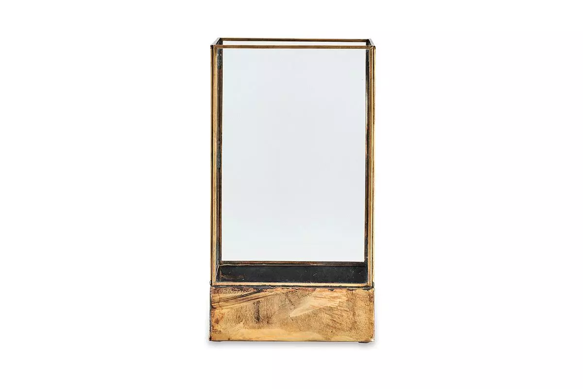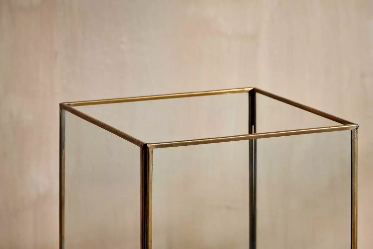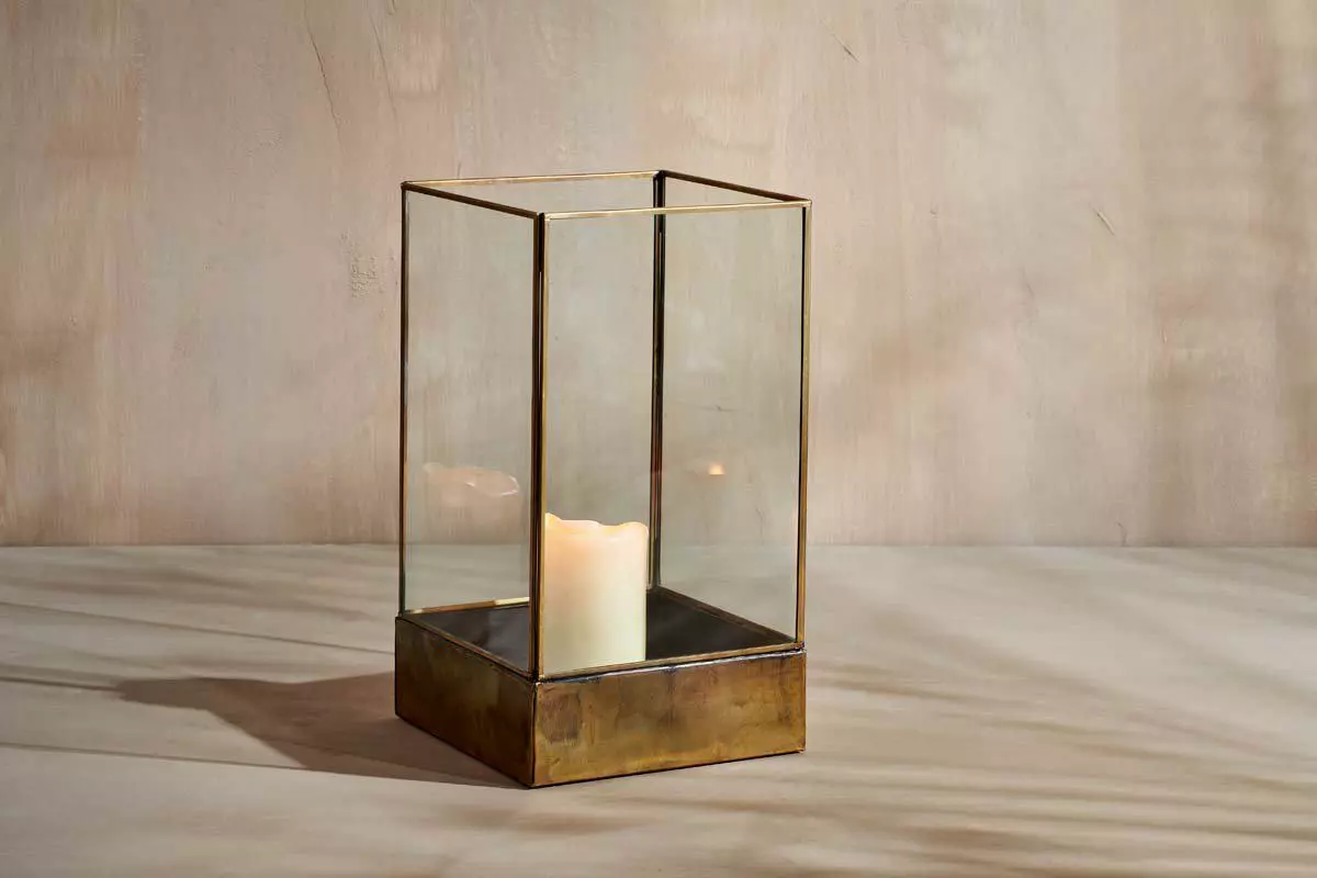 Our tall Sampara Storm Lantern makes a striking centrepiece, its appealing antique patina is complimented with a deep brass base and elegant contours. Display with a church pillar candle and create a warm, soft atmospheric light.