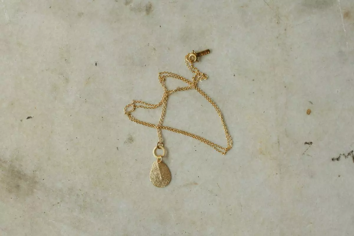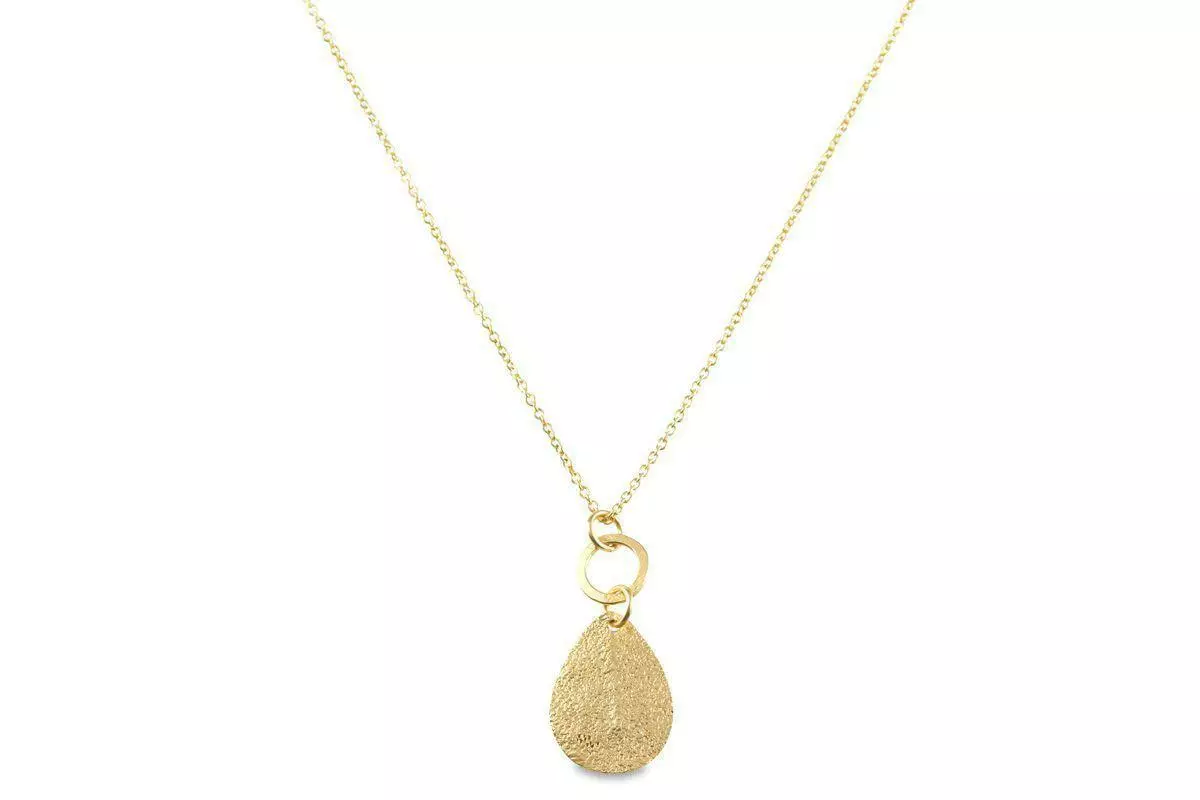 This pendant necklace is handmade from brass and finished in 22k gold. They have a hammered texture and are handcrafted as part of a fair trade enterprise in Rajasthan. Hypoallergenic and nickel free.