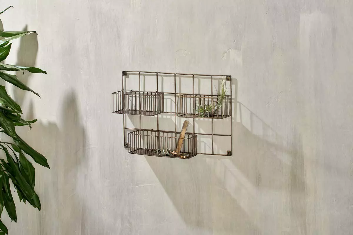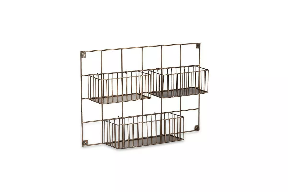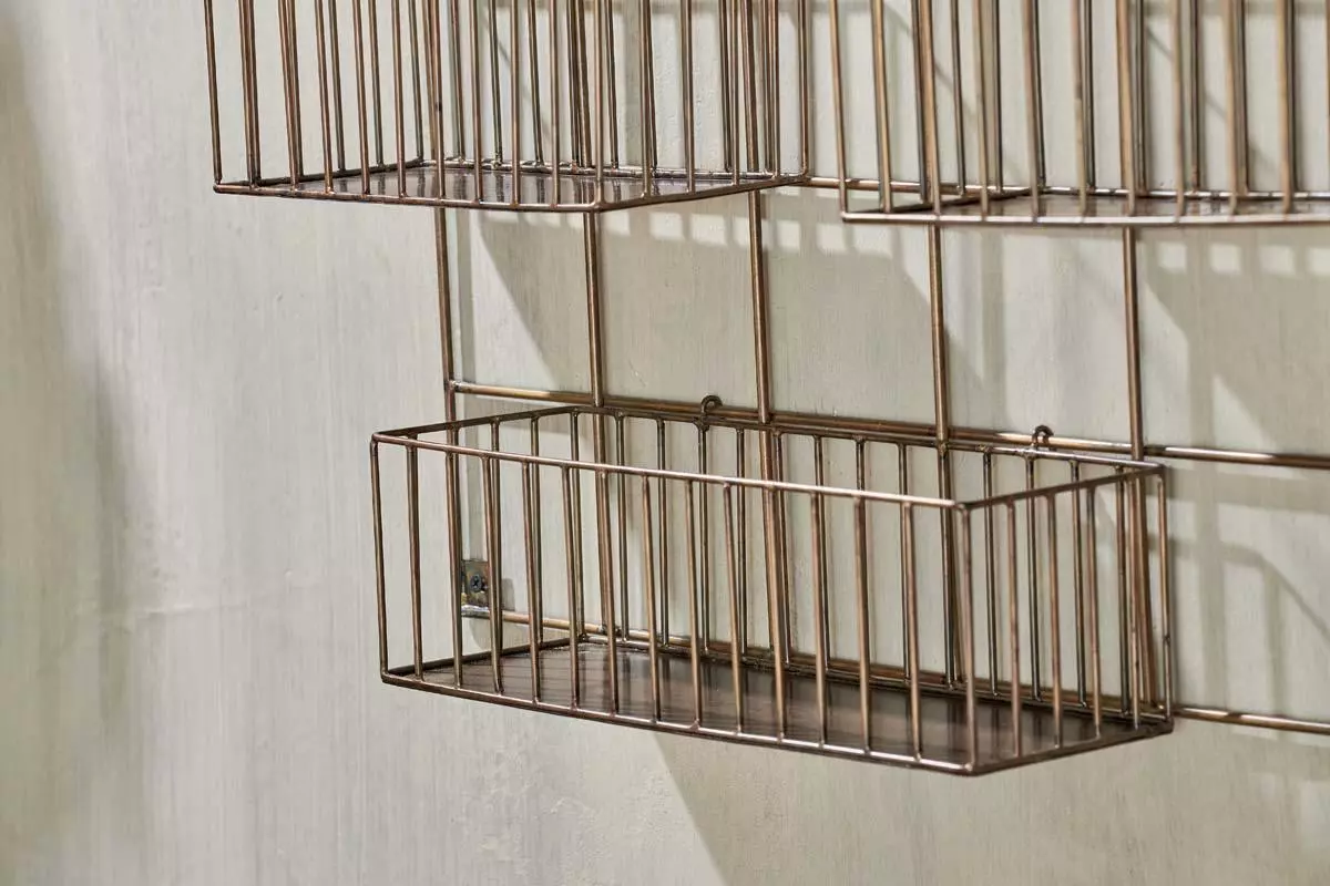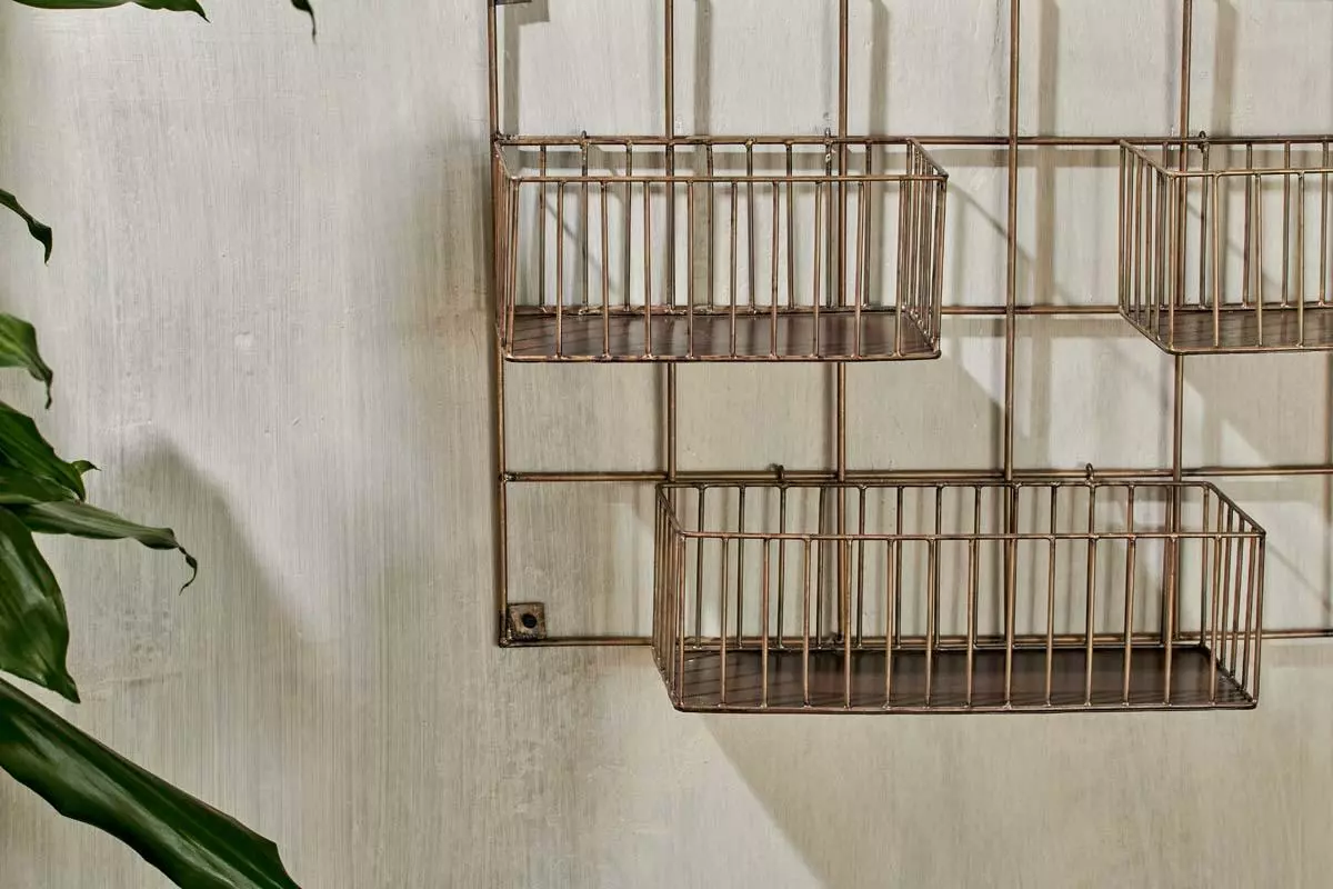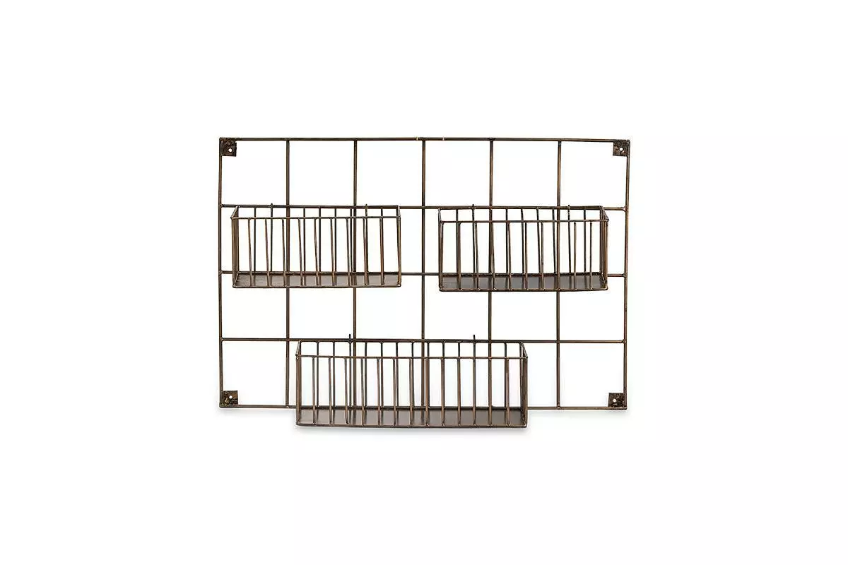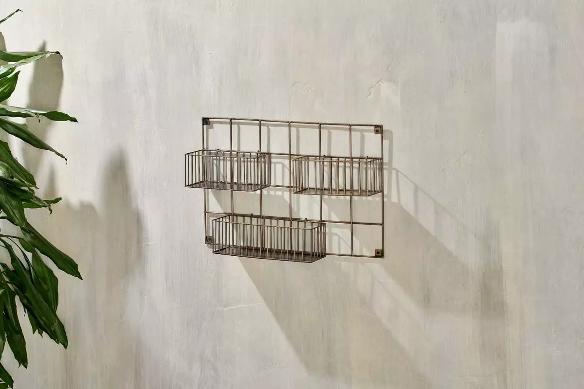 Our Jalgaon Wall Shelf combines versatility with function and style. The iron wall grid has an aged antique brass finish and includes three separate baskets that can be arranged in a number of practical positions. Ideal in a home office or dressed with greenery.