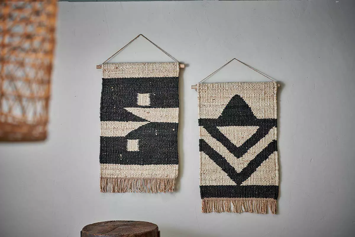 These handwoven wall hangings have a solid wood bar and hessian hanging tie.