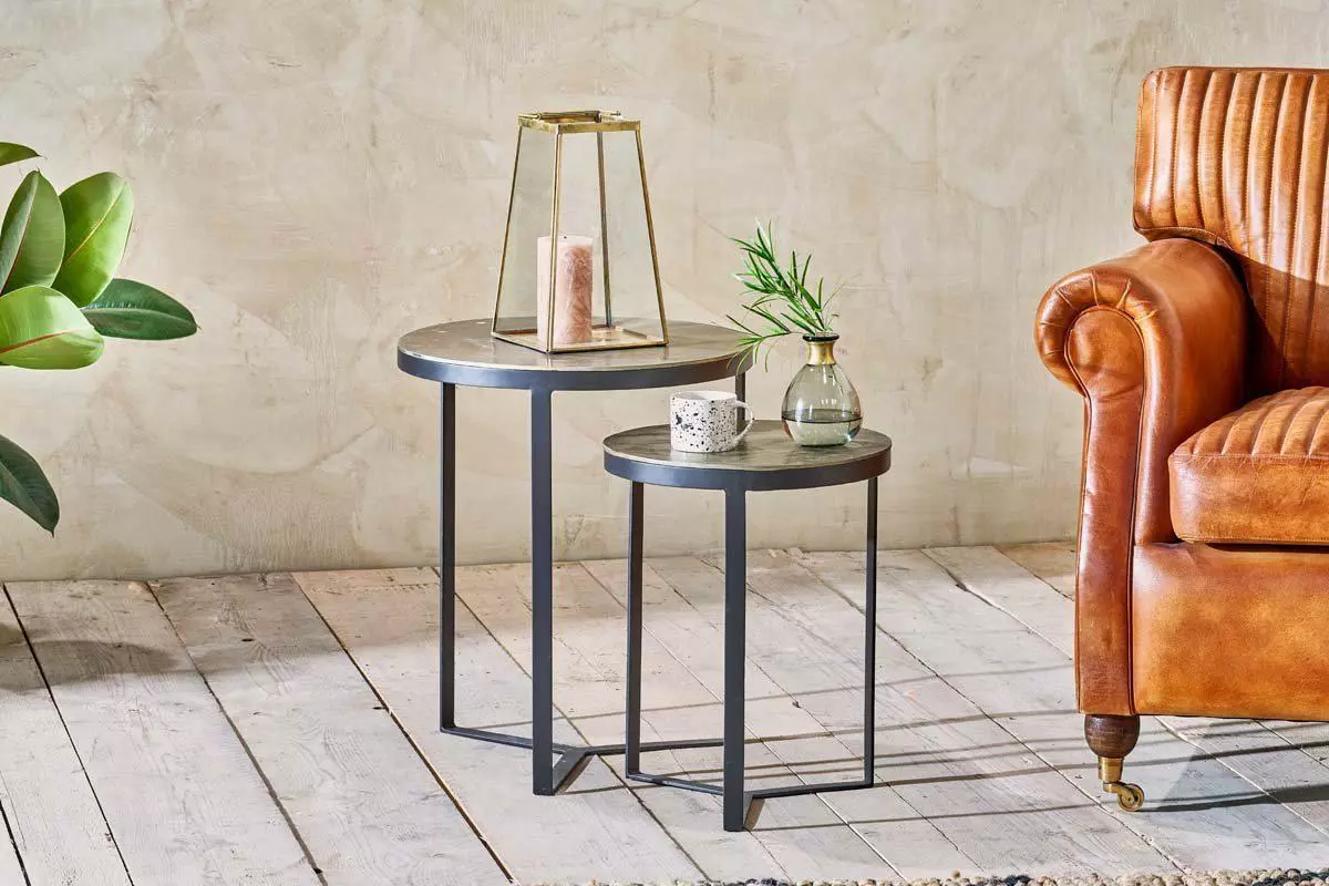 The table tops have a deliberate aged -weather appeal that is imperfect with a varied patina.