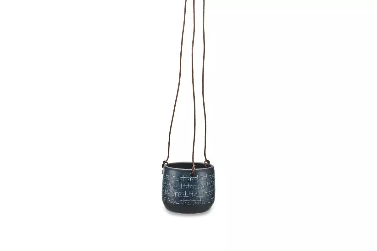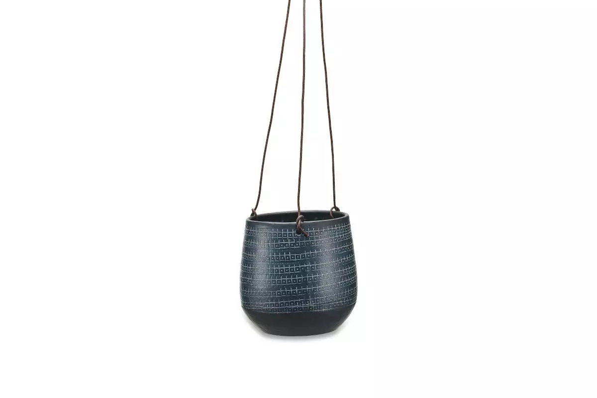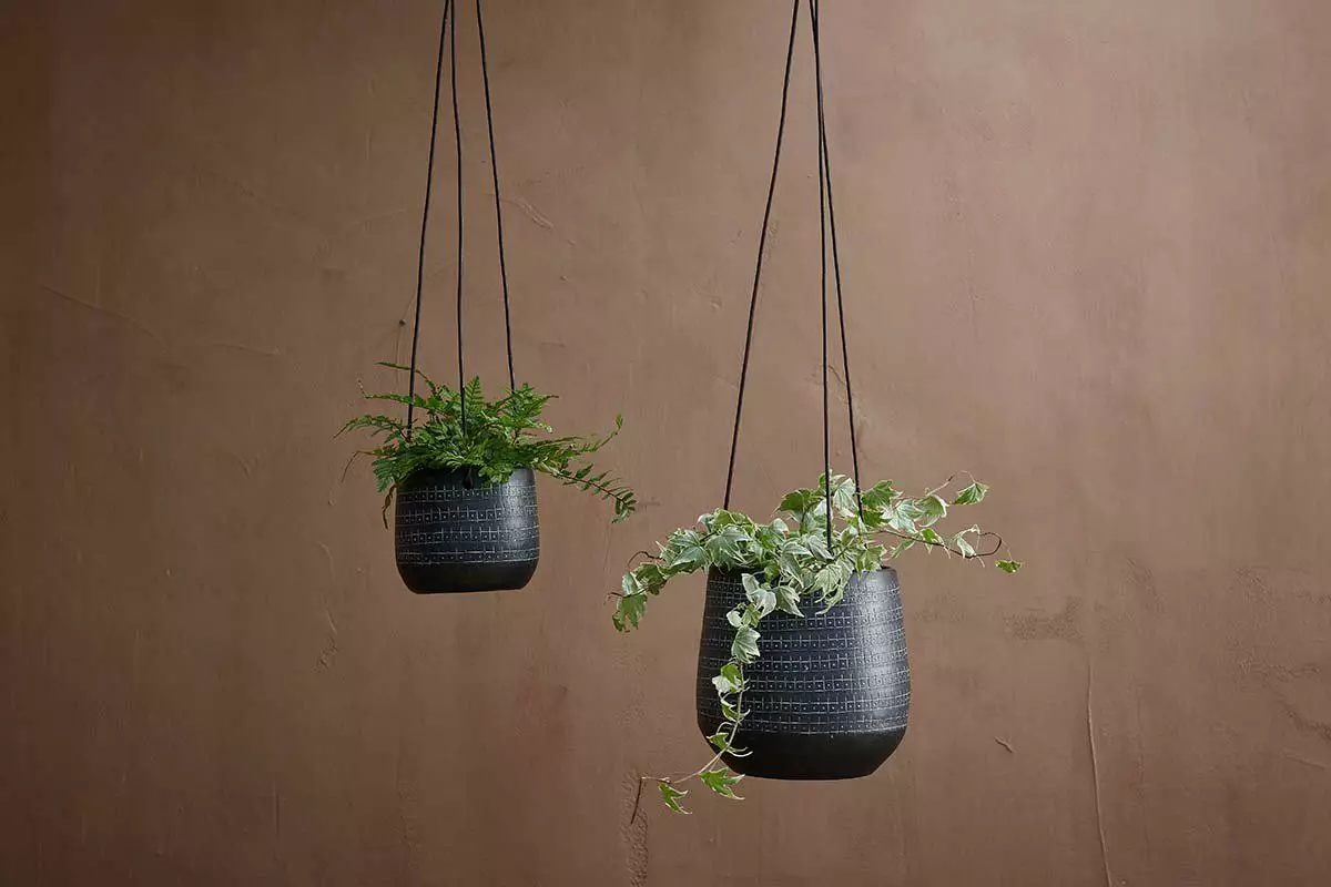 The eye-catching pattern on these Mahika hanging planters is beautifully crafted by hand. The design gives each one a unique feel and adds to their tactile qualities. The dark metal finish provides a stylish contrast to the verdant greens of indoor plants.