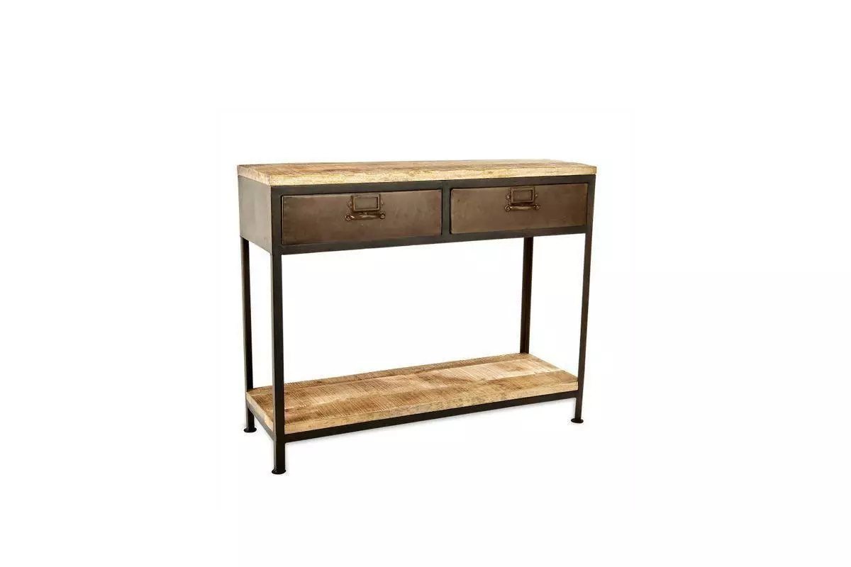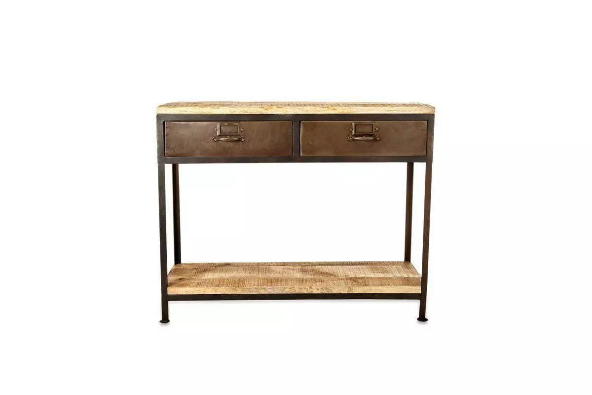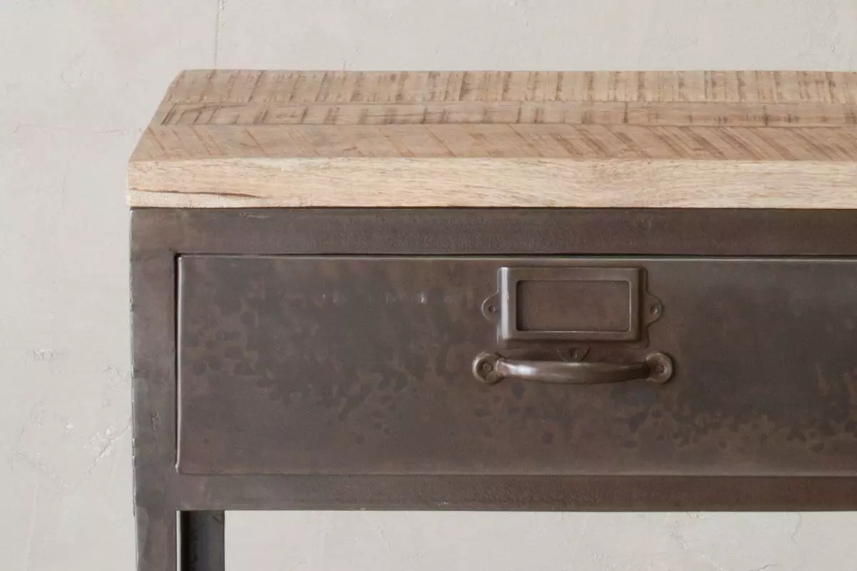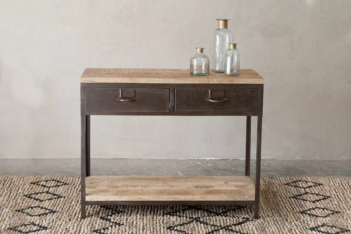 The rust finish of this industrial console table has a warm patina that compliments the solid wood top and shelf. The console table contains two useful draws. Style in a hallway or living space.