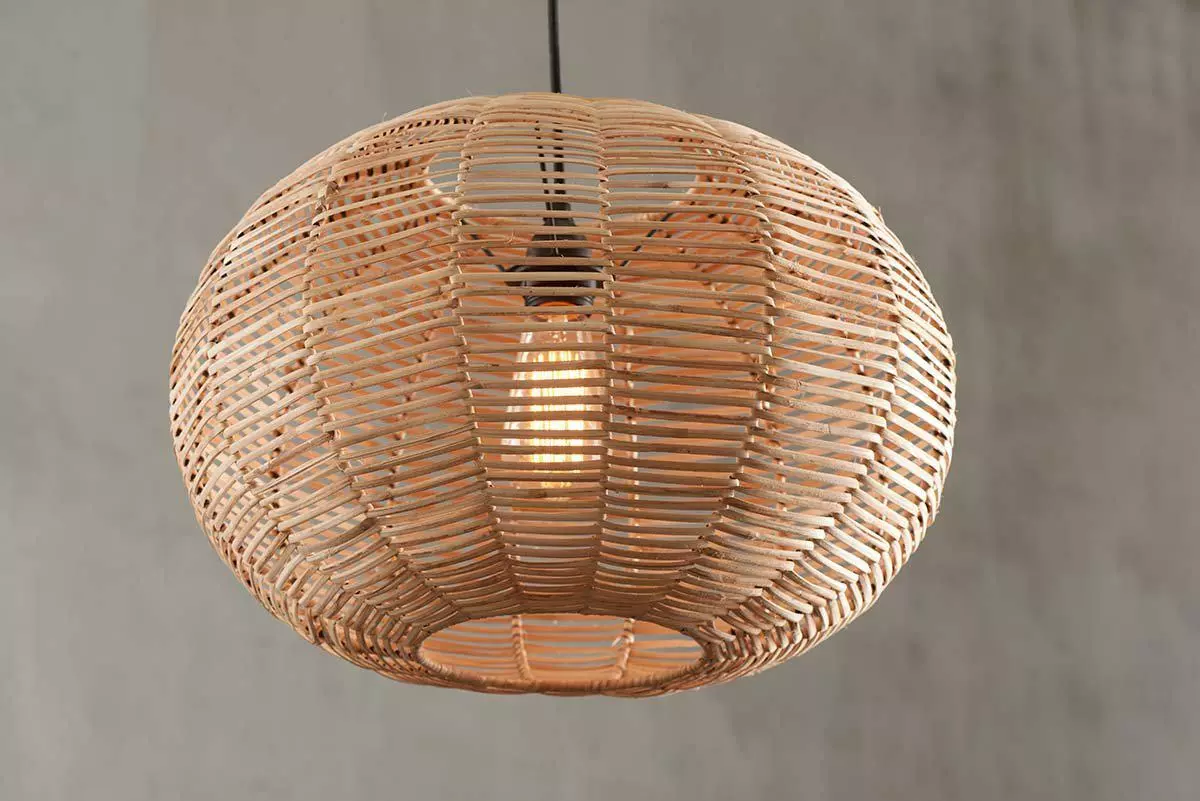 This spherical natural wicker pendant-light is beautifully constructed in a Nordic style. It is finished with a brass ceiling rose (14cm dia) and black fabric cord (1.5m).