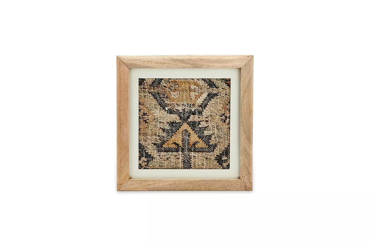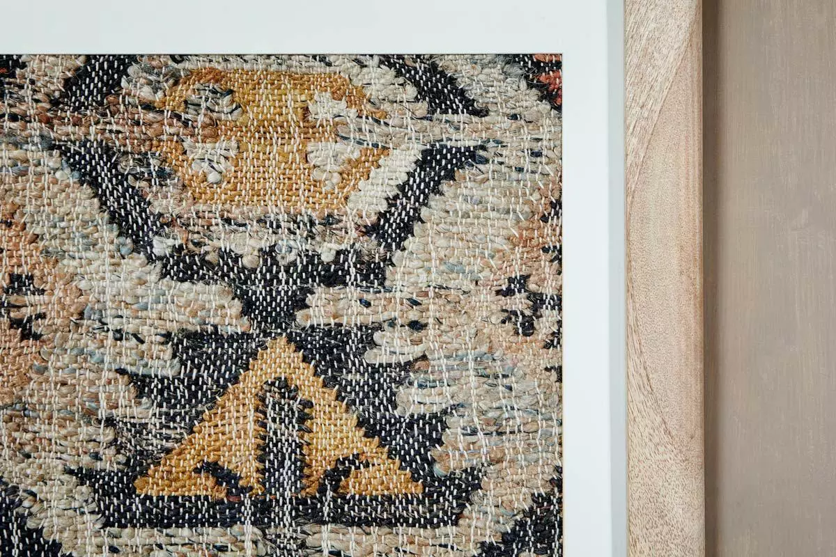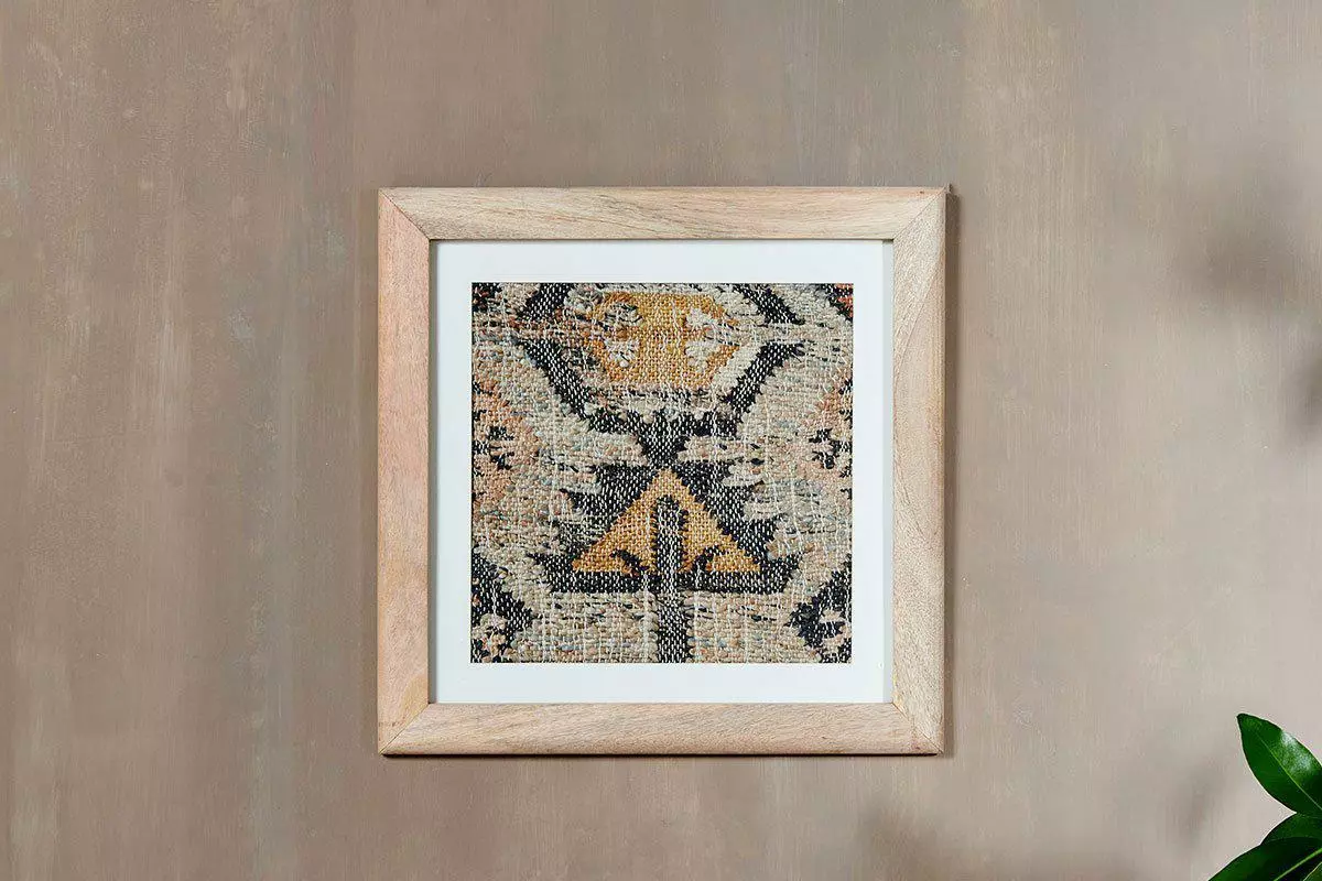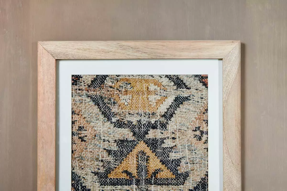 Ornate fabrics are a great form of wall art and our beautiful Pemali Kilim artwork is skilfully handwoven on traditional handlooms. The woven design is created with a mix of natural, mustard and charcoal threads. The Kilim is framed in a sustainable mango wood frame.