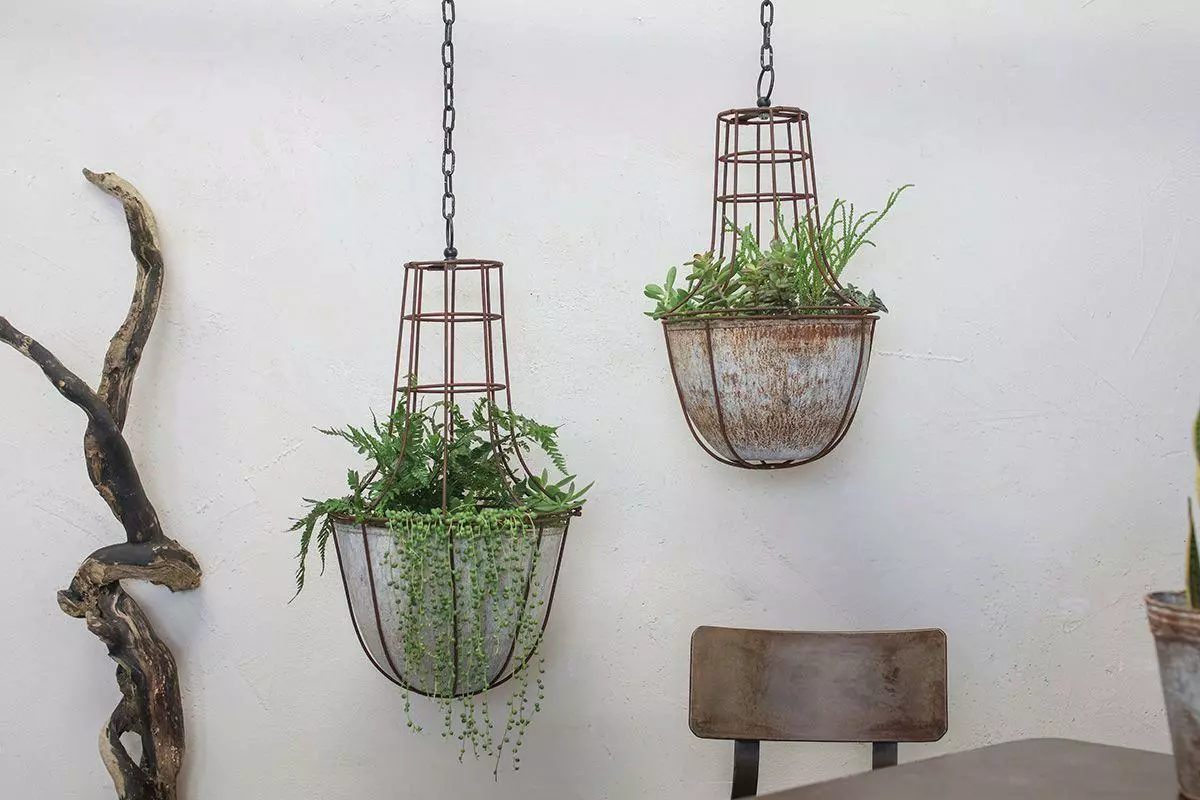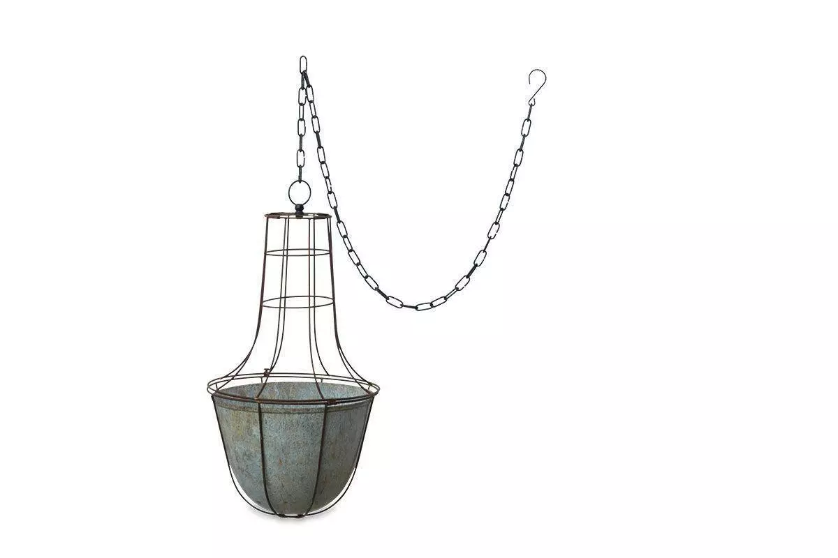 These well proportioned zinc hanging planters are supported with a rust coloured cage, that offers support and structure to the plants within.