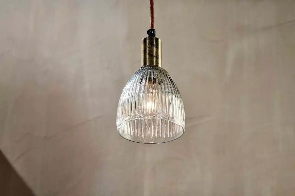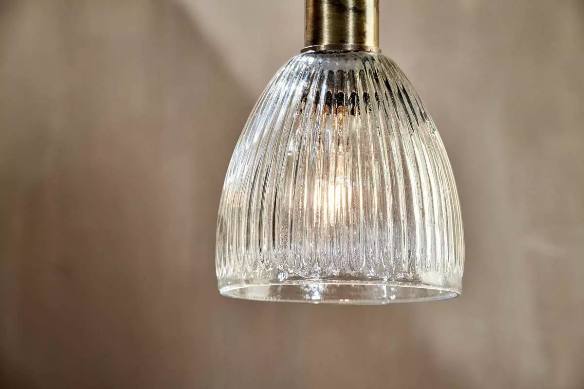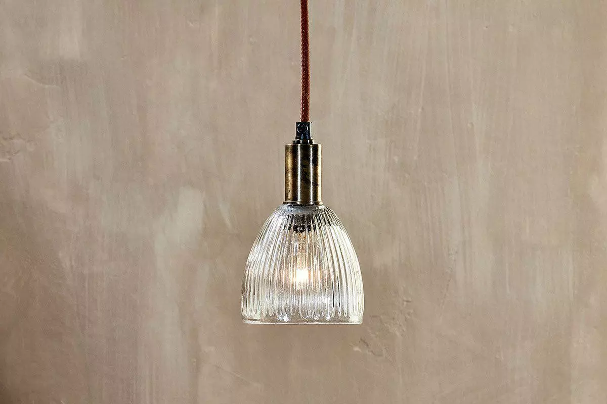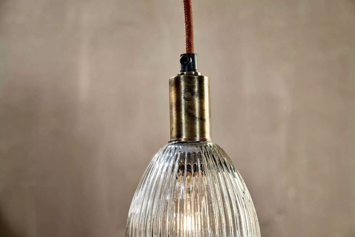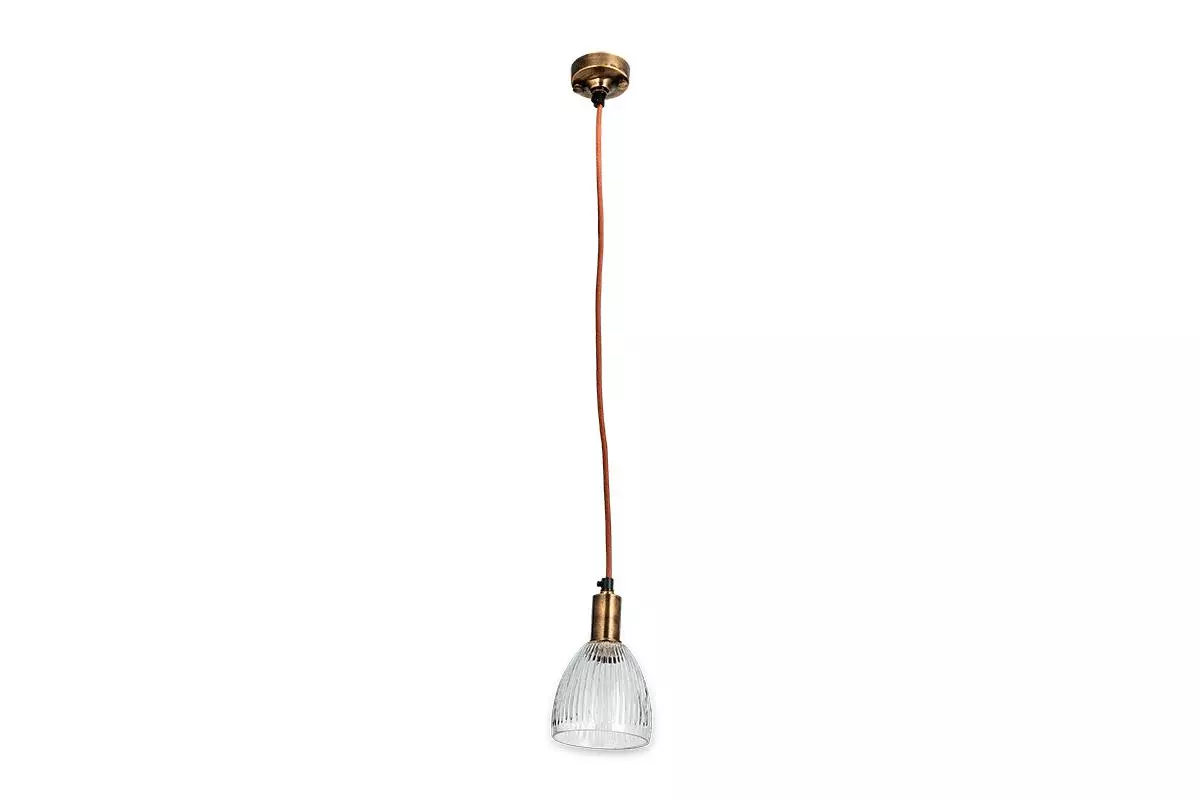 The endearing and elegant design of our Rarni Pendant combines ribbed glass with aged- brass fittings and a rust fabric cord. Style in multiples along a table or above a kitchen island.