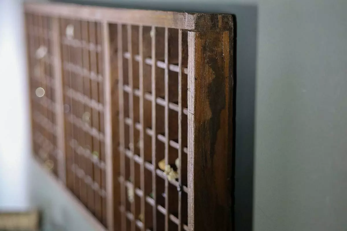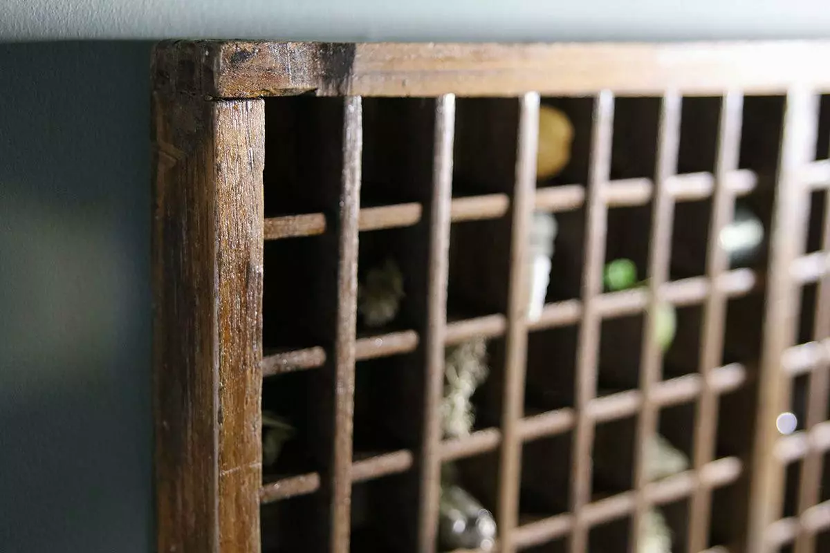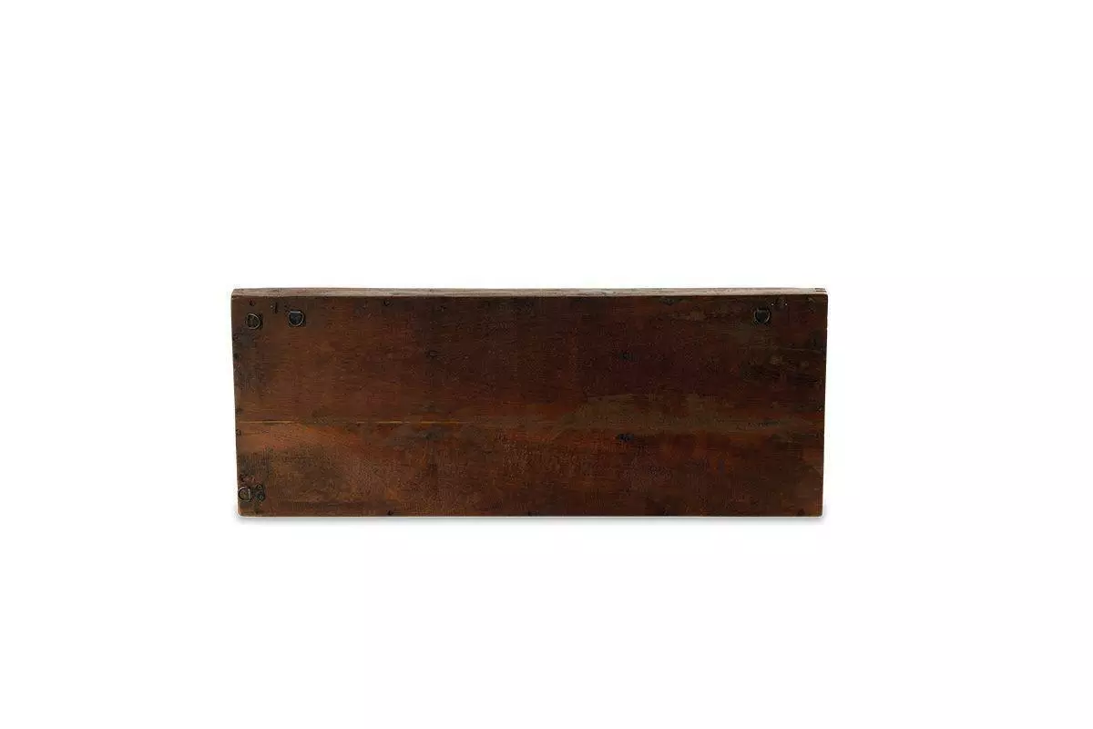 We carefully curate our reclaimed pieces in India. The many squares of these reclaimed printers drawers vary in size, originally handmade for letter blocks the drawers are made from a dark wood.