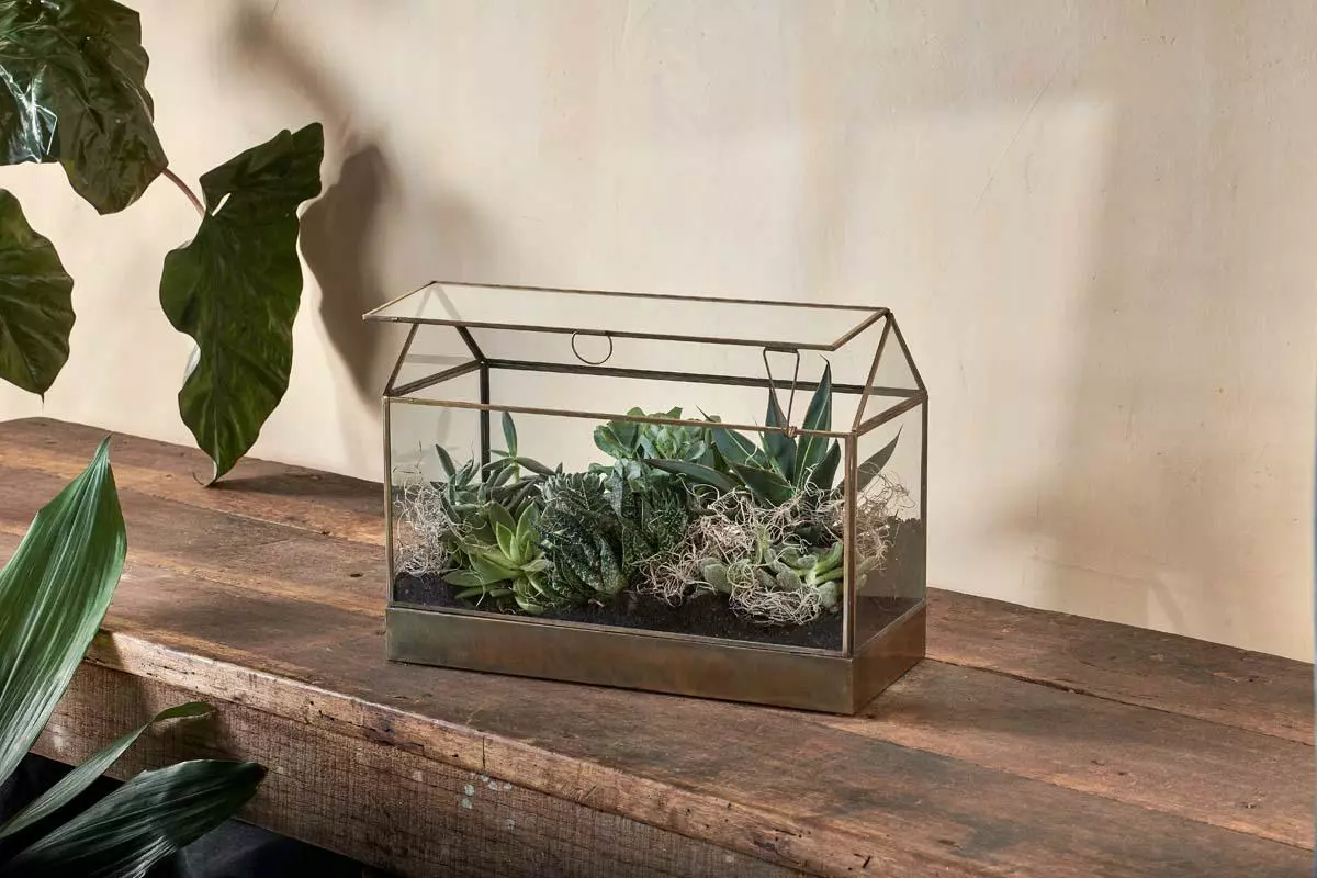 The antique brass finish of our striking Sampara Terrarium, adds to its elegant design. The deep rectangular tray is perfect for potting a miniature garden. The glass roof opens for ventilation, with a brass latch that supports it.