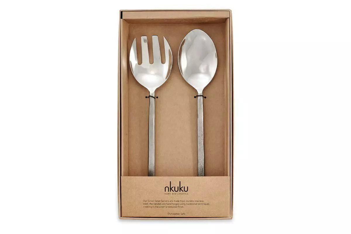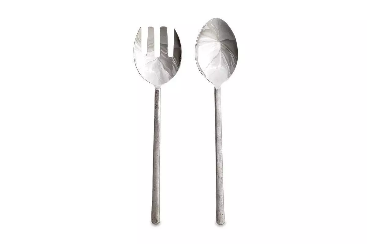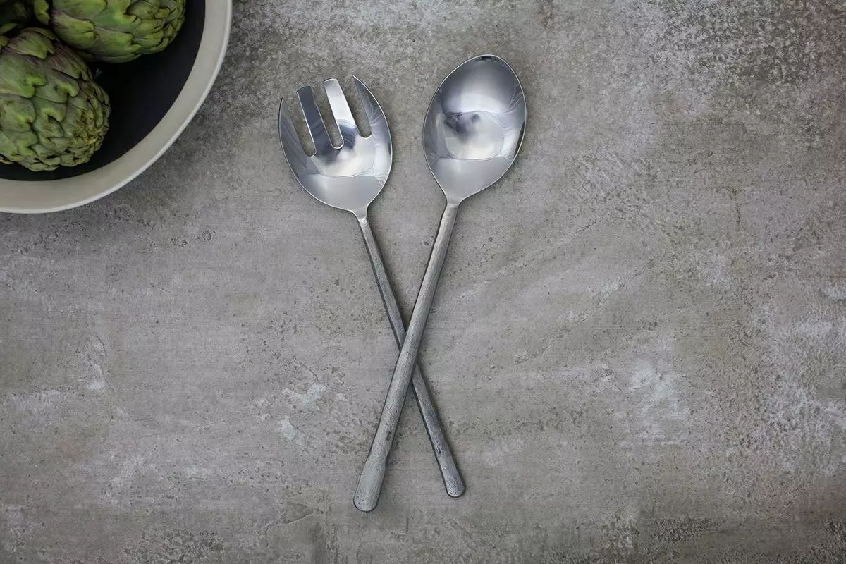 These brushed silver salad servers have hand forged handles that wrap around a stainless steel serving spoon and fork. A great addition to the table.