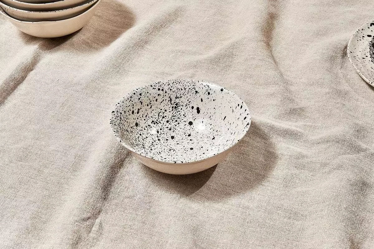 These organic shaped cereal and pudding bowls are decorated with a striking black splatter pattern.