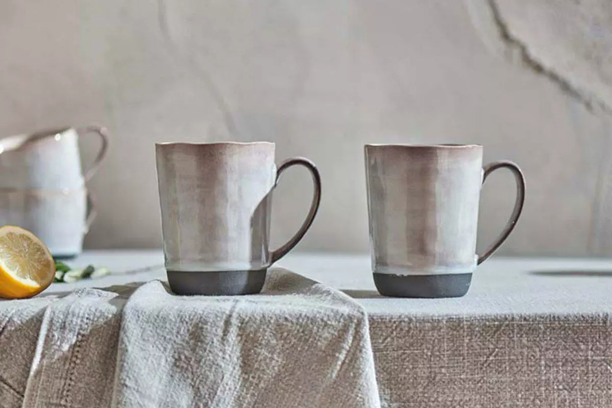 The tactile, rustic quality of our tall Edo mugs is created by an earthy palette of textures in subdued slate and an off -white glaze.