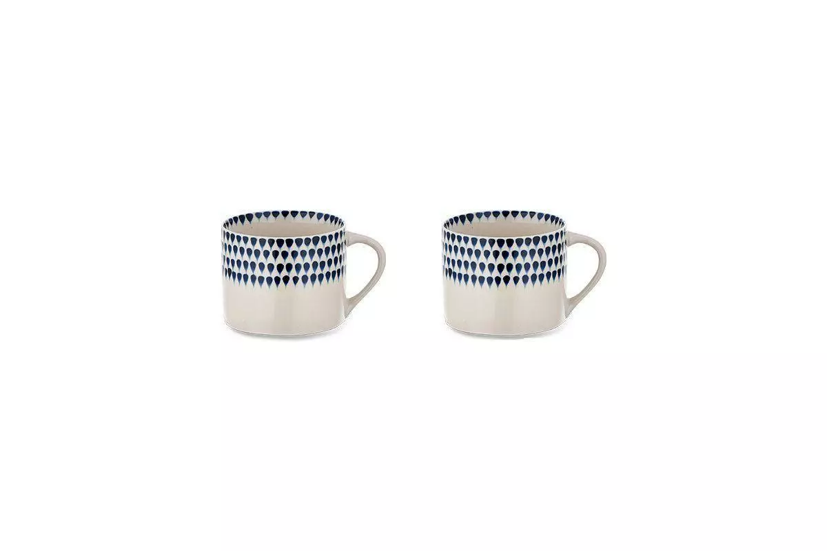 These perfectly proportioned coffee mugs are hand painted with a stunning indigo drop design. The pattern features around the lip of the mug and contrast perfectly against the off-white glaze.