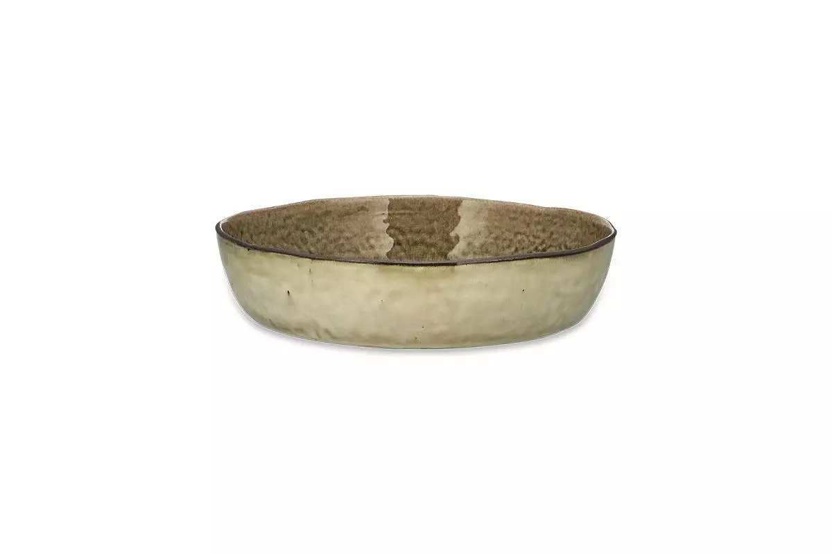 Our low sided Simi Serving Bowl has a deep moss green glaze, set off by a contrasting exterior off-white tone. Ideal for salads, breads and sharing dishes.