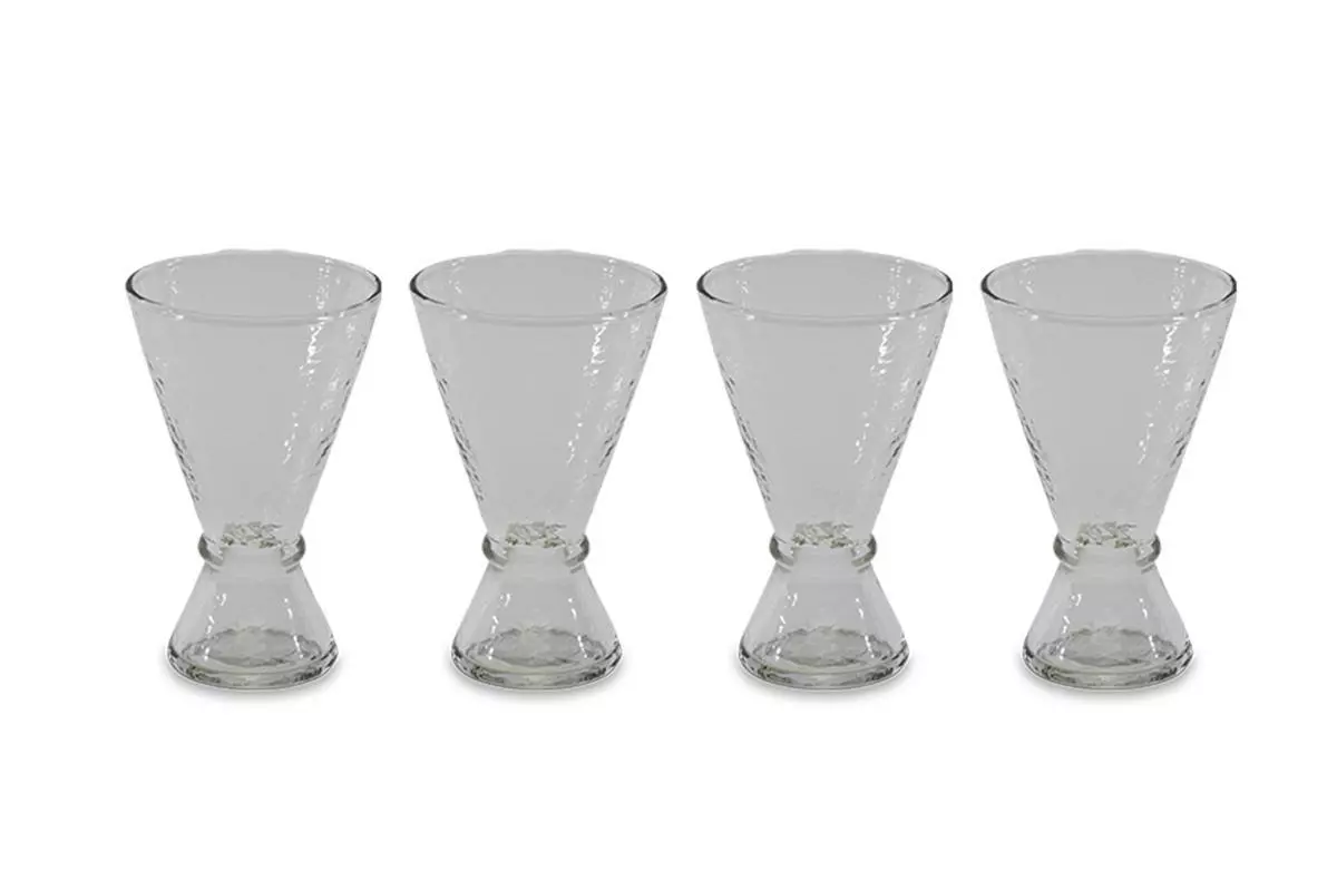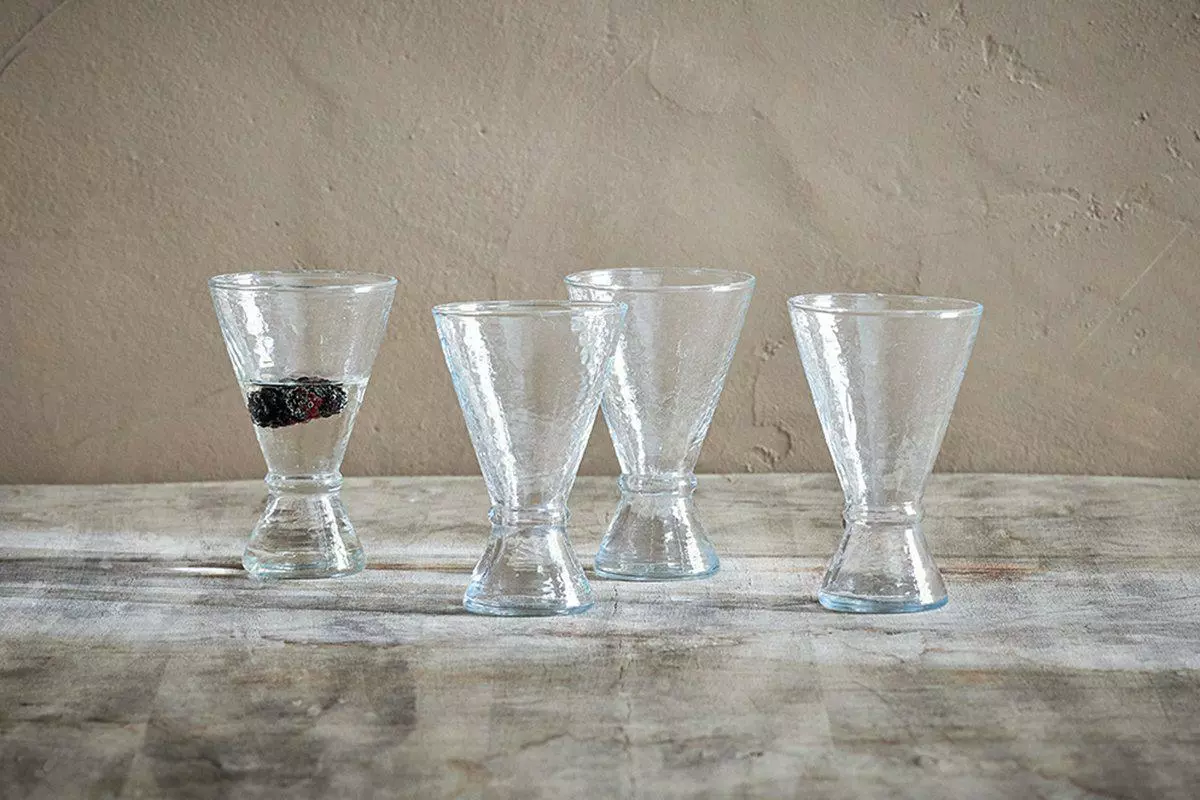 This gift set of large rustic, hand – blown wine glasses is a pleasure to behold. The glasses are hammered when still molten, creating this textured edge that catches the light and adds a tactile quality to each glass. These wine glasses have a unique design, the shape curves in and out in a conical shape.