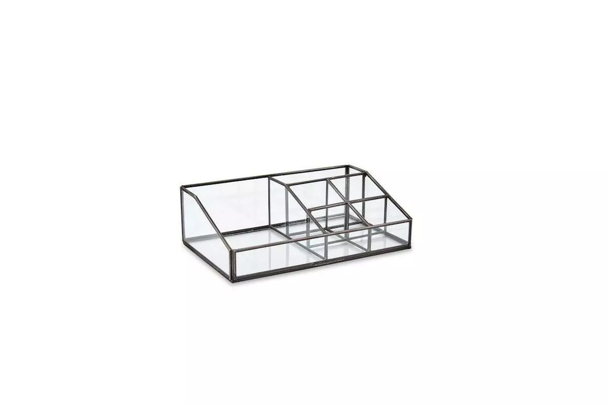 This well-designed black metal and glass desk organiser is made up of several compartments all designed to keep desk stationery in order.
