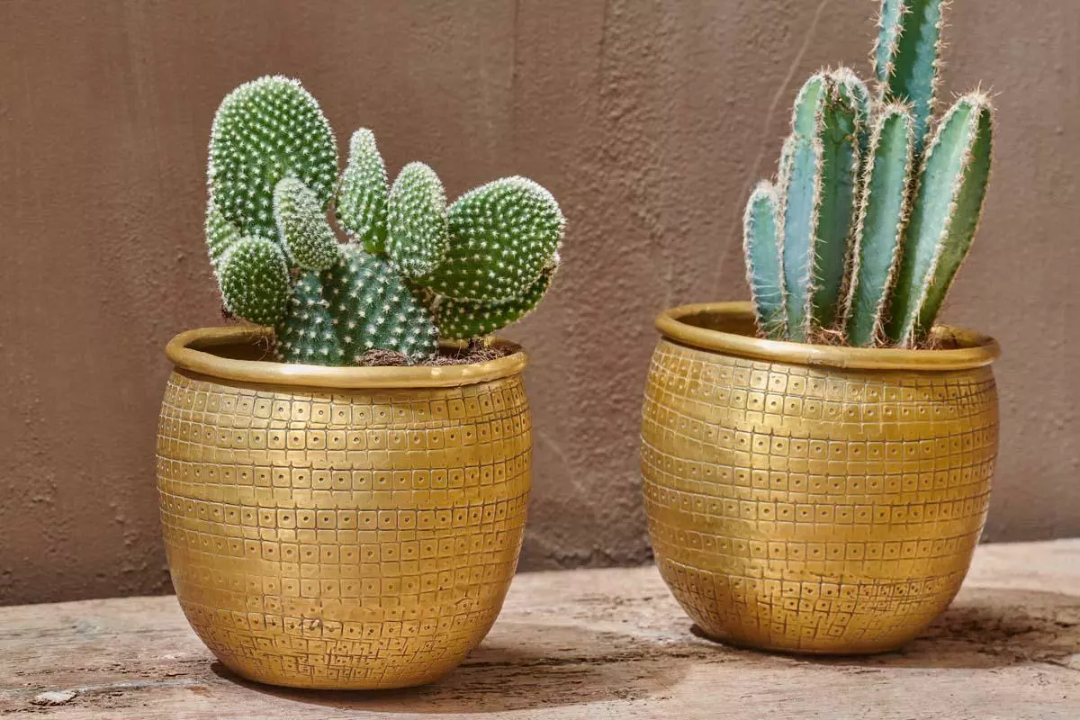 This set of two, stylish Tembesi small planters, would make a striking windowsill display. The etched pattern is crafted by hand onto the aluminium base. The planters have an eye – catching black exterior and antique brass interior.