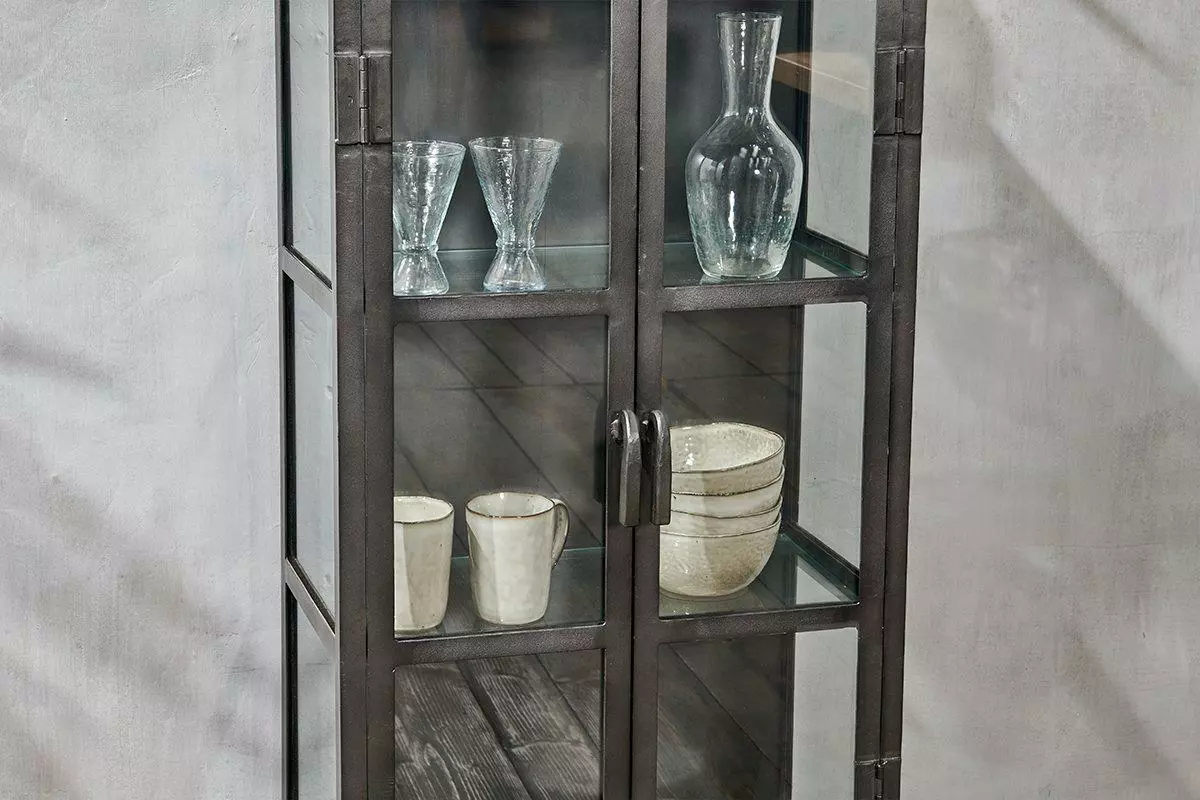 The thick iron frame suits this small cabinet. The glass shelves, front and sides add to the elegance of this practical piece.