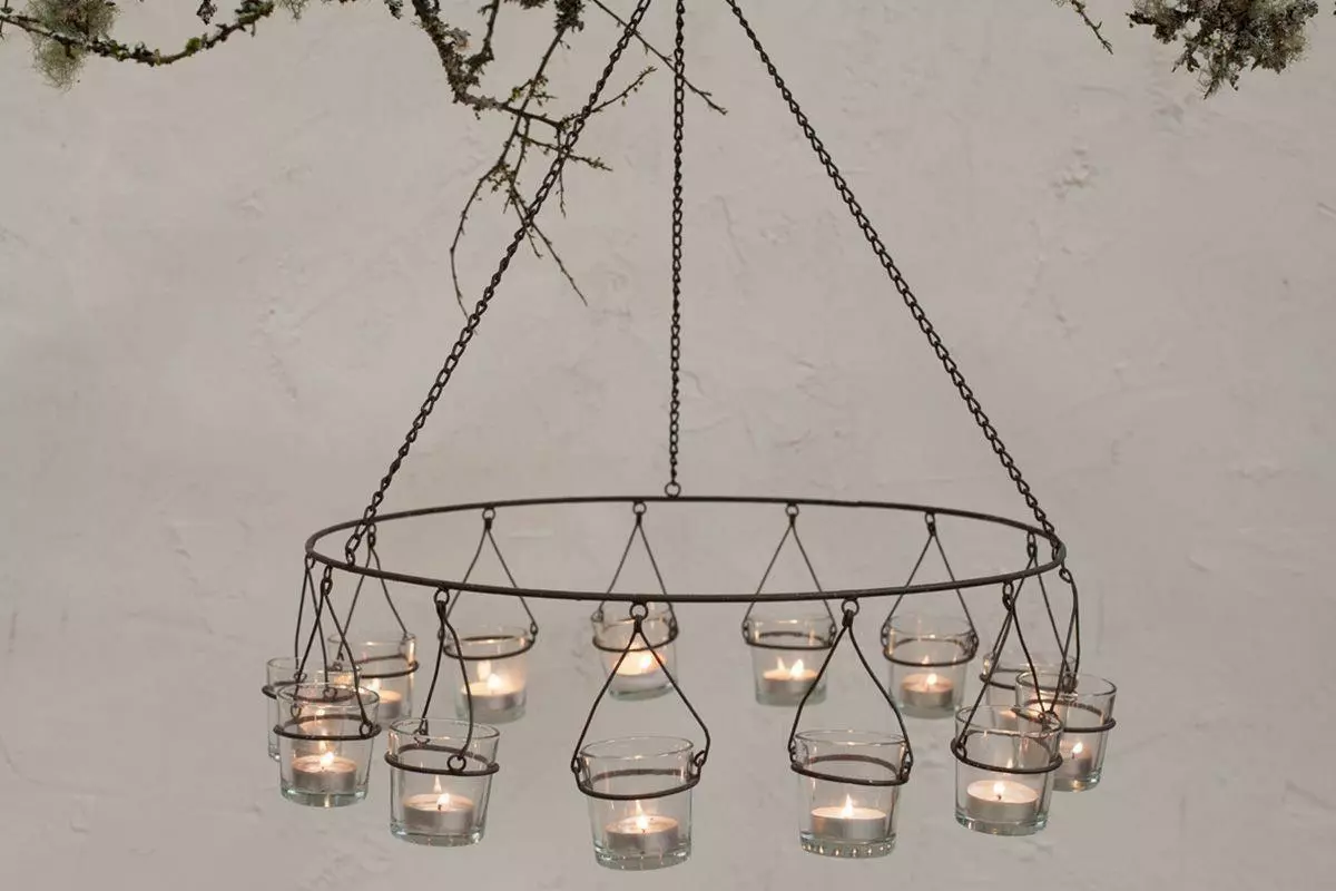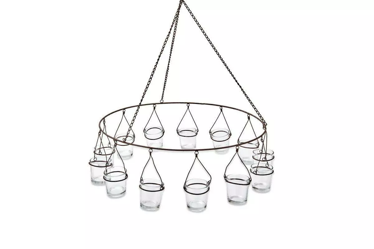 Fill each of its small glass holders with t-light candles and hang securely above a table inside or out.