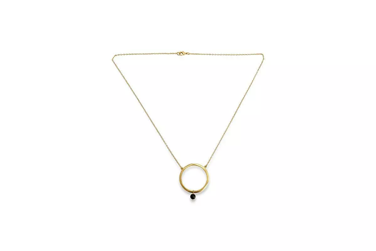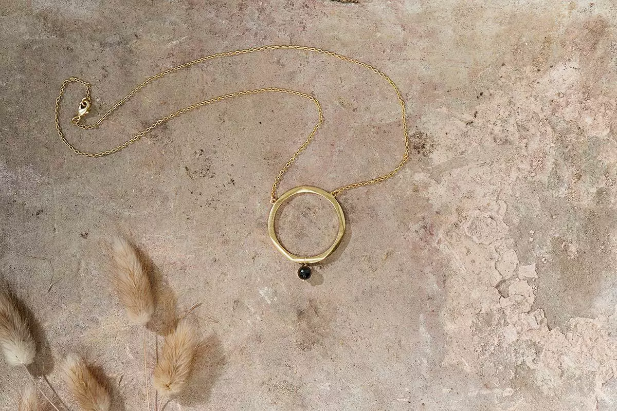 The elegant circular pendant of our Zana necklace has been delicately crafted and adorned with a single piece of Onyx. The jet black natural stone forms a striking contrast against the rich gold ring.